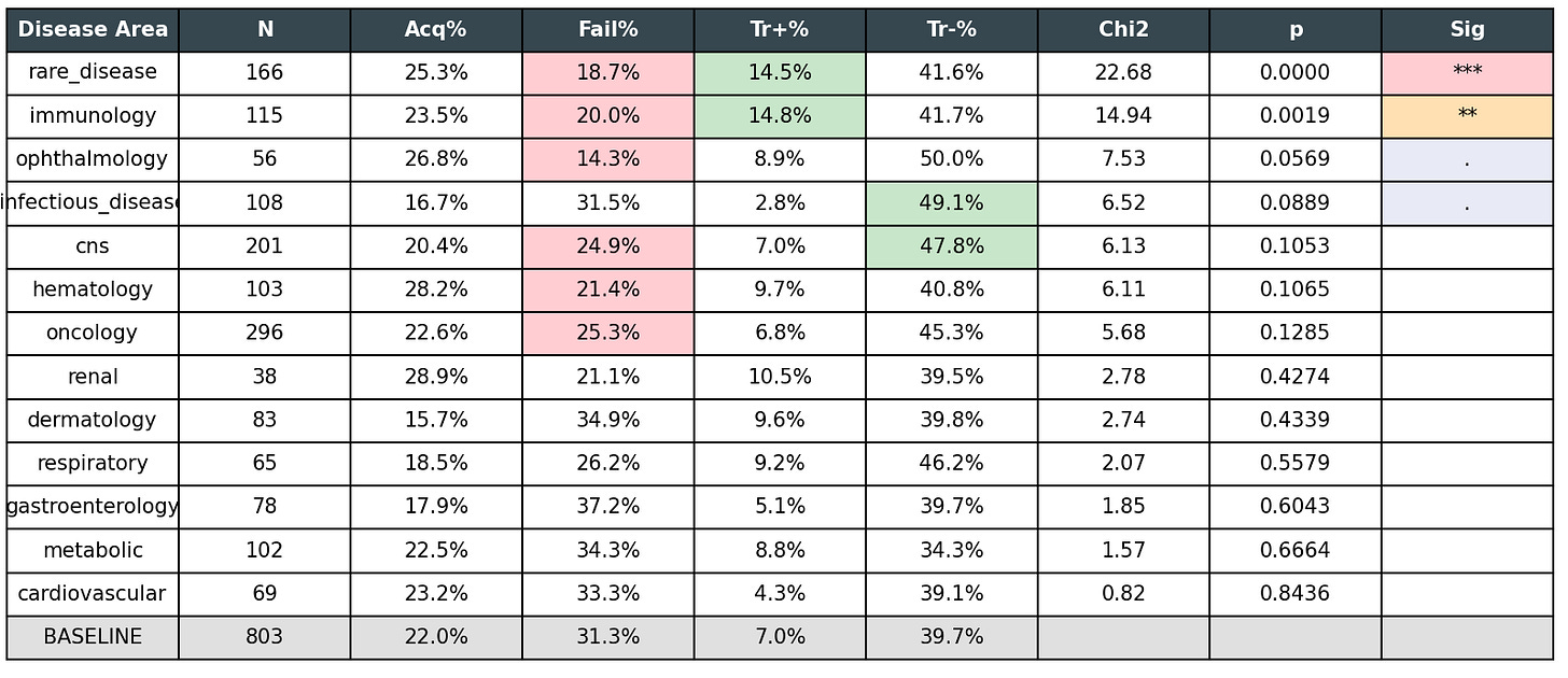 Rare diseases and immunology are good (less likely to fail, more likely to have positive CAGR).