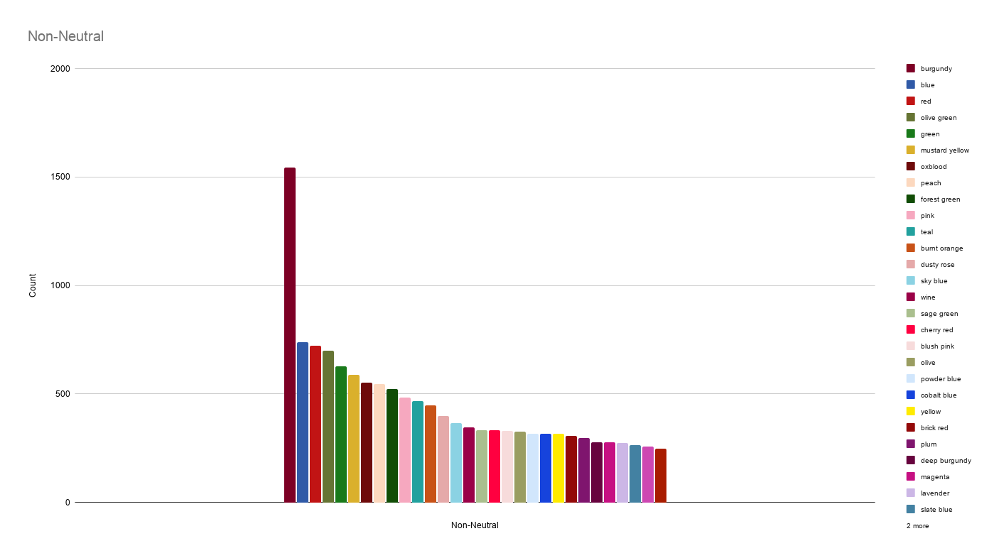 We also see burgundy as the most common non-neutral color (whereas it’s almost always red in that slot), and the new color “oxblood” (a dark, brownish red) in the #7 slot, as well as many other dark and muted tones.