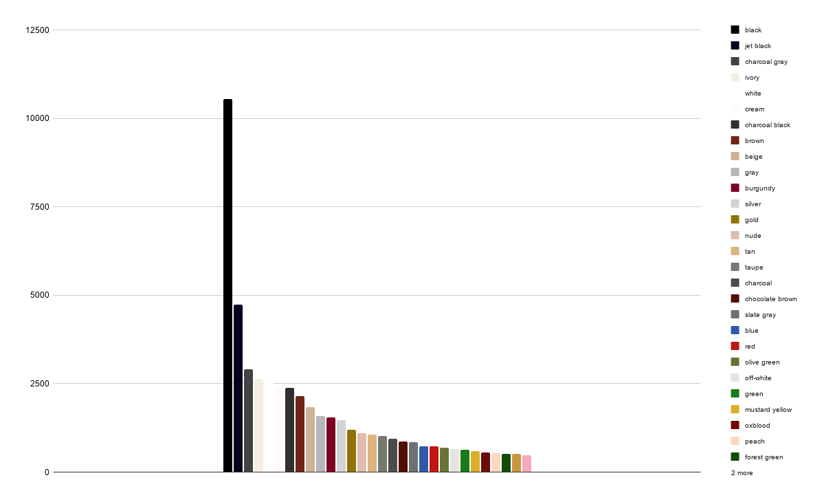 As you can see, there’s a lot of black. Well, there’s always a lot of black; black is always the #1 color; but this time around, the near-synonym “jet black” is also in the #2 slot, and “charcoal black” was #7, neither of which were top-30 colors in past years.