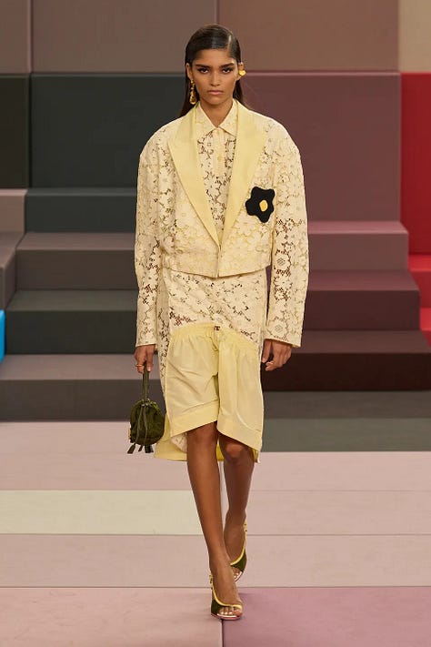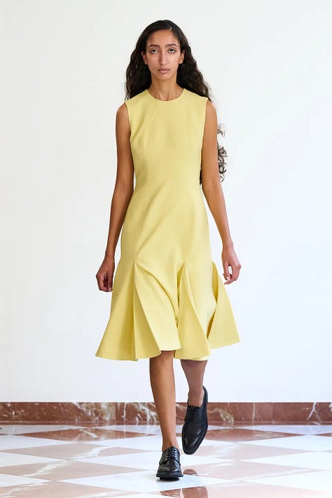 The whole pastel range, from pink to peach to mint green to pastel blue to lavender, makes a strong showing in the SS26 collections, but pastel yellow is the biggest “winner” in this year relative to past years, mostly in classically feminine and preppy contexts.