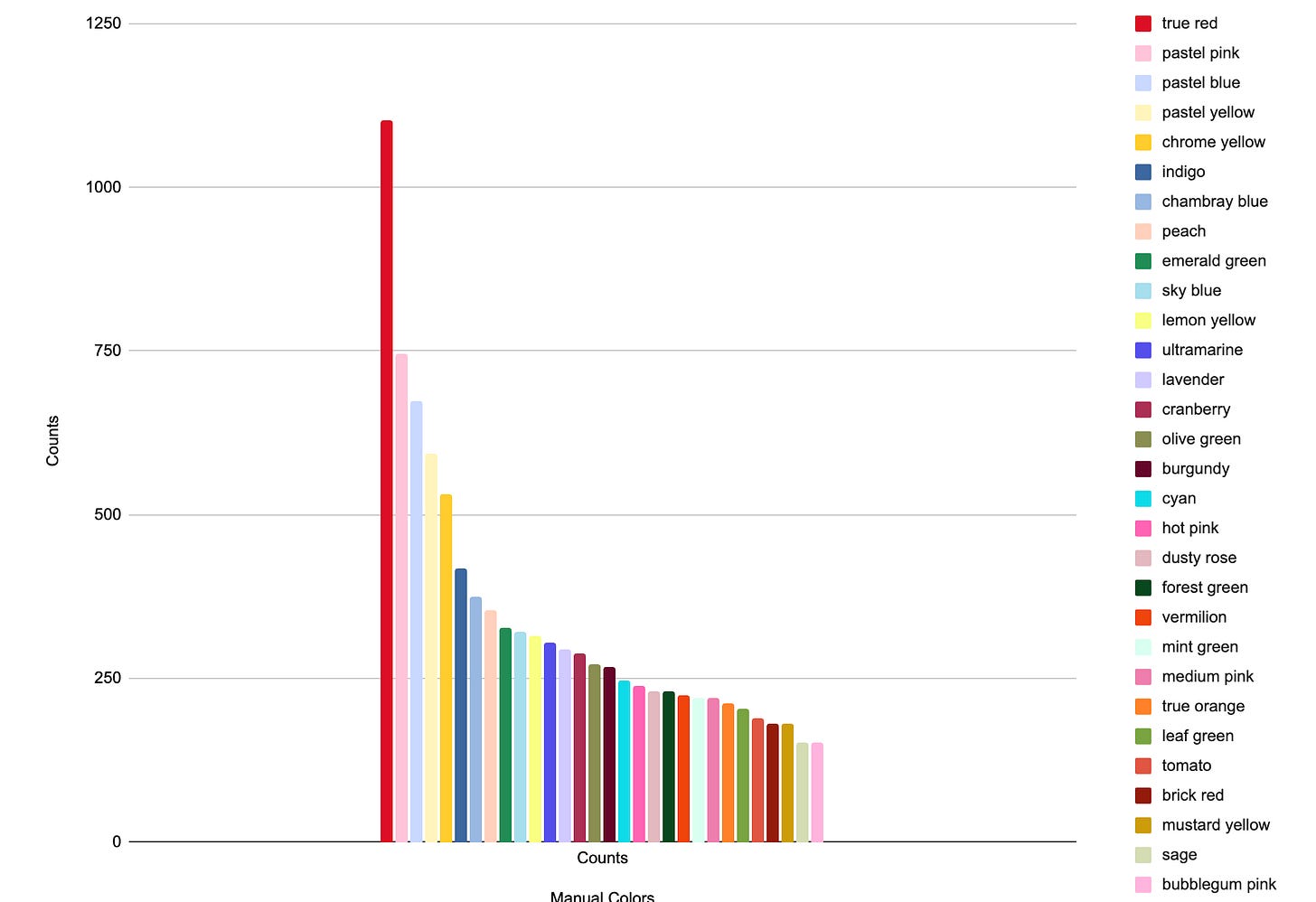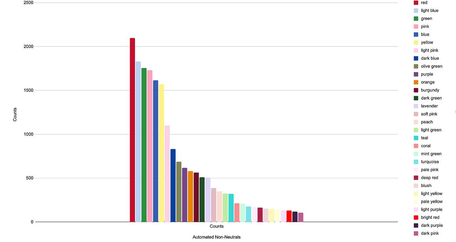 This year I did both manual counts, where I counted how many “looks” a given color (as subjectively determined by me) appeared in, and automated counts, where I asked an LLM (currently GPT-4o) to identify all the colors in the outfit in each image and aggregated the counts across images. I’m using the same code and prompt as I have for the past several years for the automated counts.